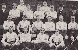 | Rochdale Hornets at Dane Street, 1875: note the different jersey designs, as players provided their own kit. |